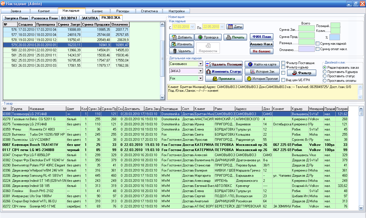 Работа с списками заказов в виде формирования накладных на закупку продажу возврат, распределение заказов на закупку продажу курьерам.