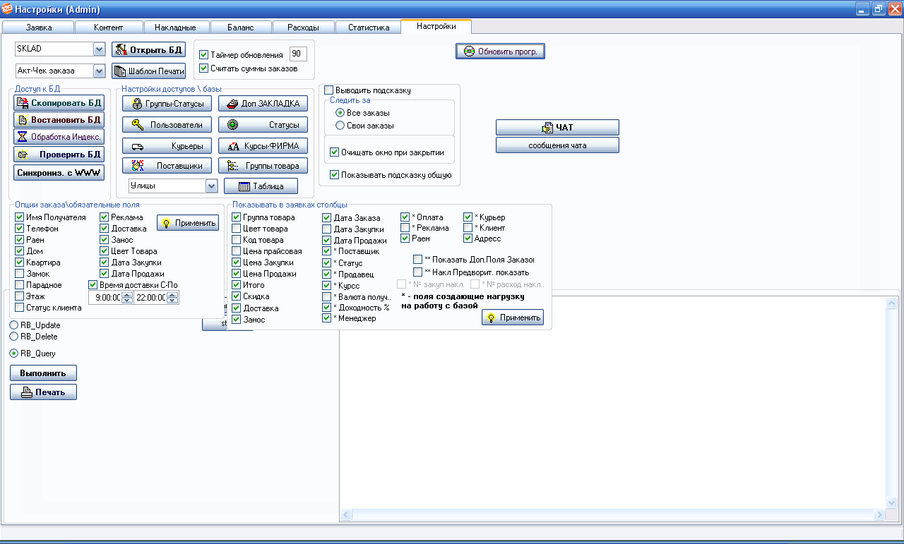 Доступ к таблицам для добавления, изменения,удаления, данных (Фирма-курсс, Поставщик, Пользователь системы, Курьер, группа товара, Статусы , улицы, раены, доп-закладки заказов).