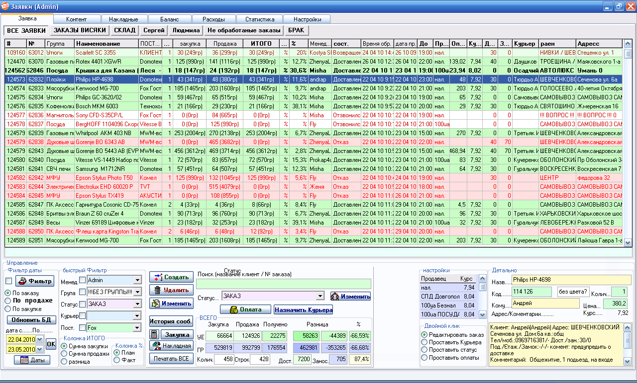 Разнообразные фильтры заказов (Менеджер, статус, поставщик, группа товара, фирма продавец(нал-бнал...), курьер, даты закупки продажи создания).