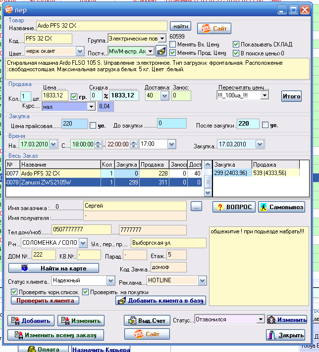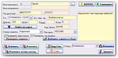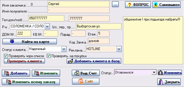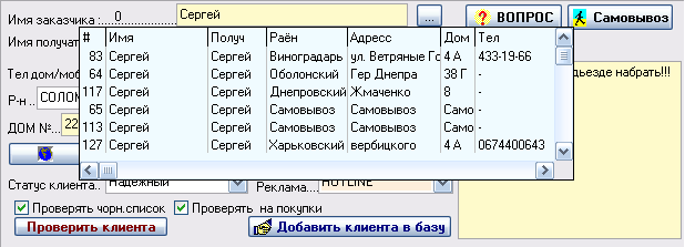 Также будет проведена проверка клиента на поиск его преведущих заказов если стоит соотв галочка и система предупредит об этом.