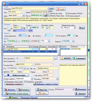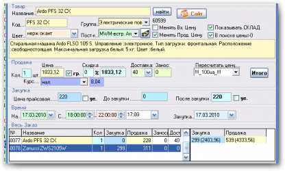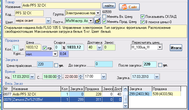 цвет, количество, скидка, курс, доставка-занос, время и даты заказа (закупки, продажи, доставки)