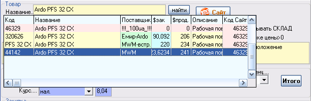 После выбора товара в поиске, автоматом заполнятся соотв поля свойств товара. Можно будет воспользоватся кнопкой сайт для поиска выібраного товара в гугле, каталогах, на своем сайте.